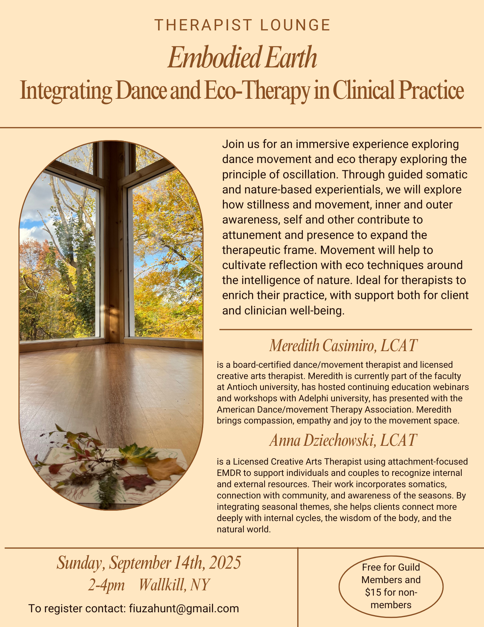 Through expressive movement, somatic awareness, and eco-therapeutic practices, participants will explore how attuning to the rhythms of winter can support embodiment and resilience. A central guiding principle of the workshop is the reminder that we are part of something larger: connected to nature, to one another, and to the cycles that shape our lives.
